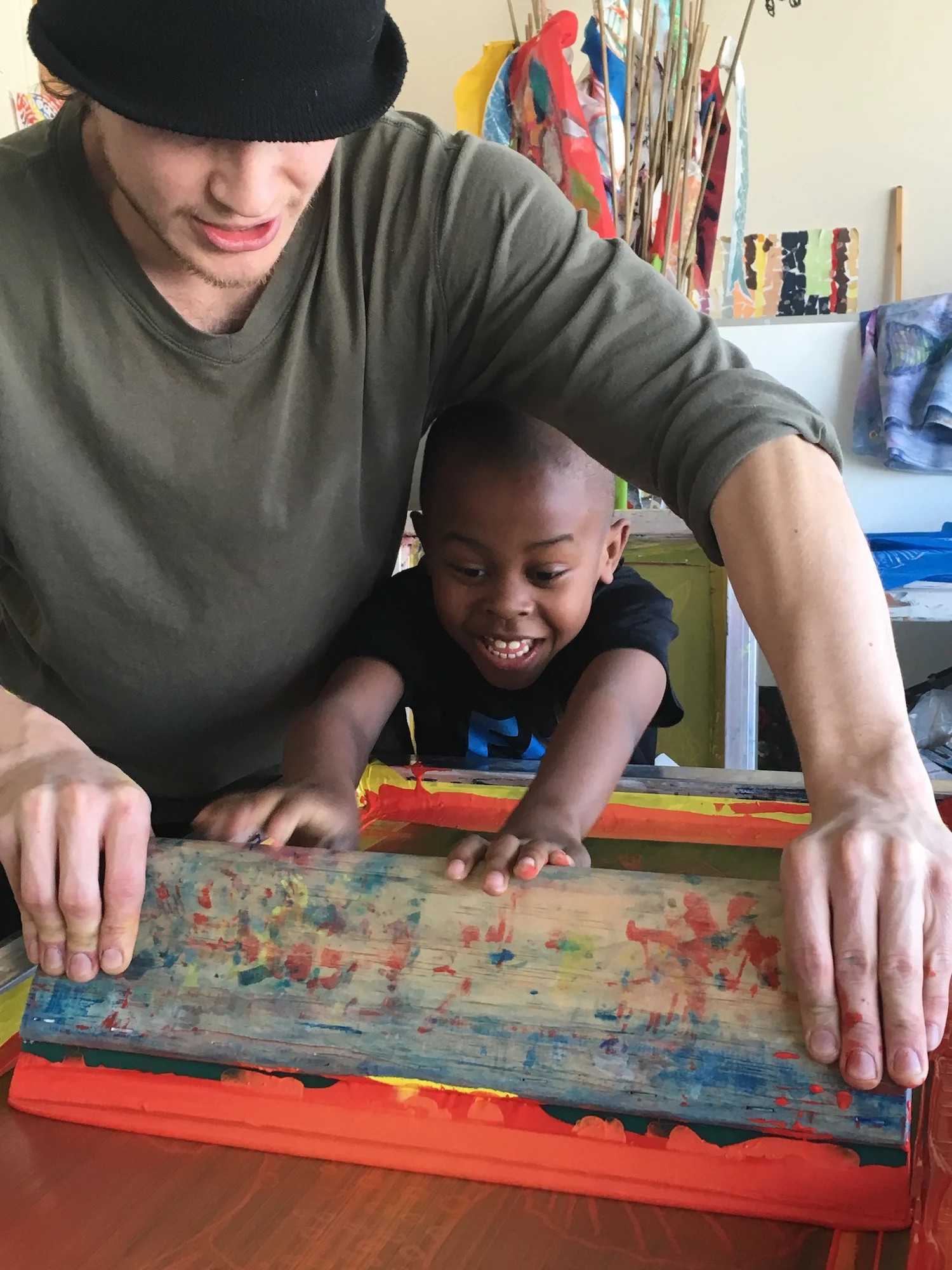 Families helped to create the printed windsocks by inking and pulling the prints with a squeegee. Many participants were trying out the screen printing process for the first time.